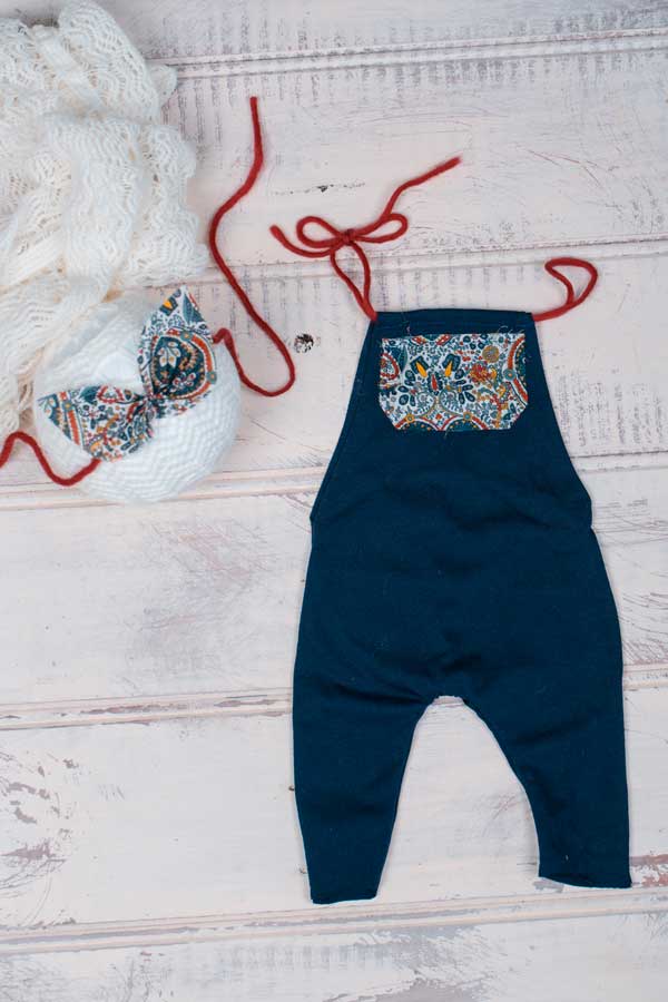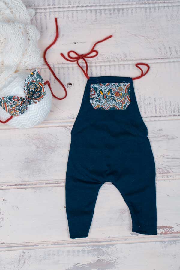 Dark Blue stretch romper with persian fabric pocket detail and burgandy wool ties. The persian pocket fabric has colours of burgandy, dark blue, teal, and mustard. There is a back pocket for the bum up pose as well. Comes with matching tieback.