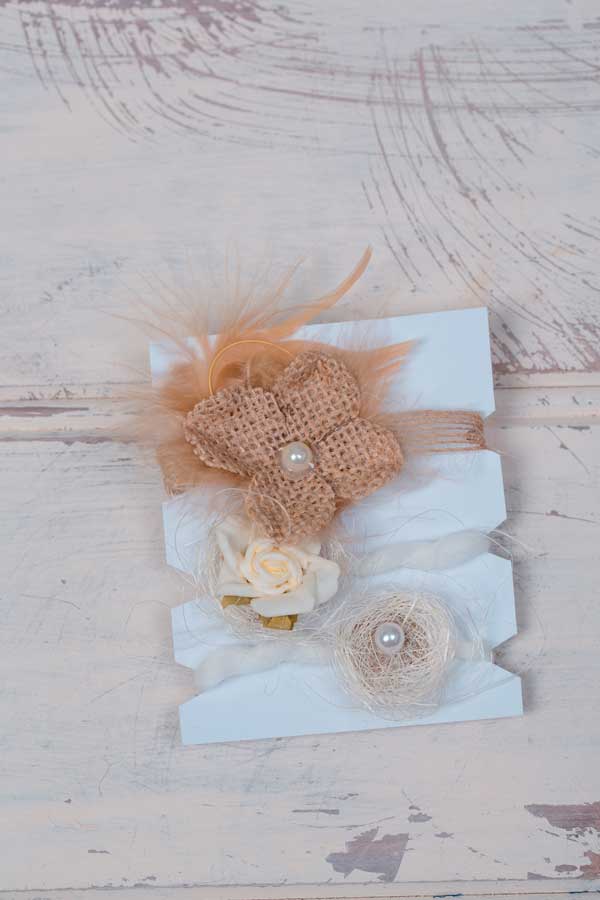 A set of three white, wool, pearl and feather nest style tiebacks handmade and each one individually designed. One has brown feathers, a pearl and hesian.